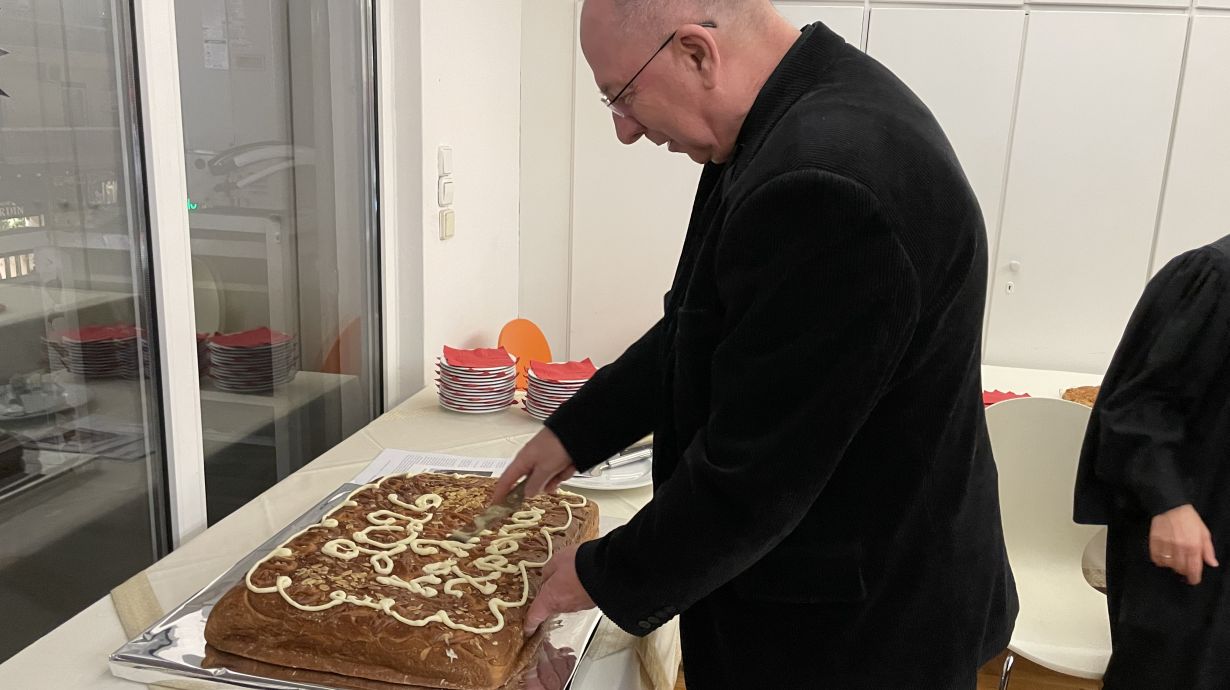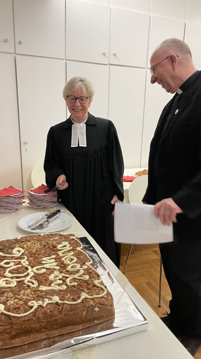 Der war sehr gut besucht und es wurde kräftig mitgebetet und gesungen. Beim anschließenden Vasilopita-Schneiden unserer großen Vasilopita, machte der katholische Pfarrer Owsiak den Anfang und schnitt die ersten Stücke ab. Ihm folgte der Pfarrer der Armenier, dann kam Pastor Moser von den Anglikanern dran, schnitt wieder Stücke klein und auch Pfarrer Sotiris von der Evangelisch griechischen Gemeinde reichte dem orthodoxen Kollegen Nakopoulos zur weiteren Verteilung die Kuchenstücke zu. Bald war der größte Teil unseres Neujahrsgebäcks an die Teilnehmenden vergeben. Plötzlich jauchzte eine Dame auf, sie hatte die Münze gefunden. Alle freuten sich mit ihr: Ein Jahr Glück für die Finderin, wem wollte man das nicht gönnen.